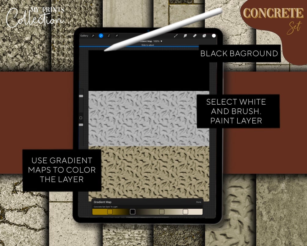 The Concrete Procreate Set has 80 Seamless Brushes to add a concrete, cracked, stone or granite effect to your digital pavements, walls or floors.