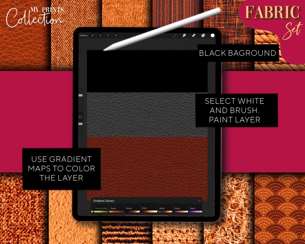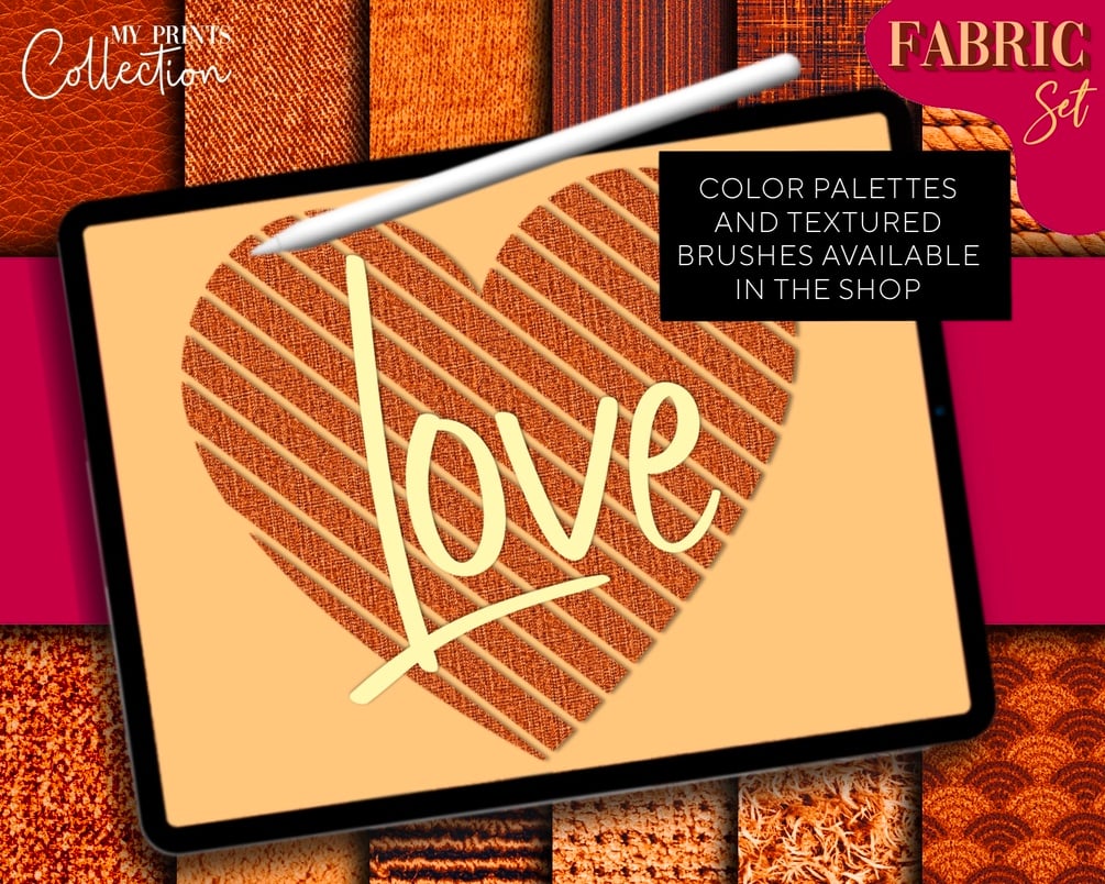 The Fabric Procreate Brush Set is the perfect Textile Procreate Kit to add leather, jeans, rope, linen, cotton and wool textures to your lettering, illustration and digital art.