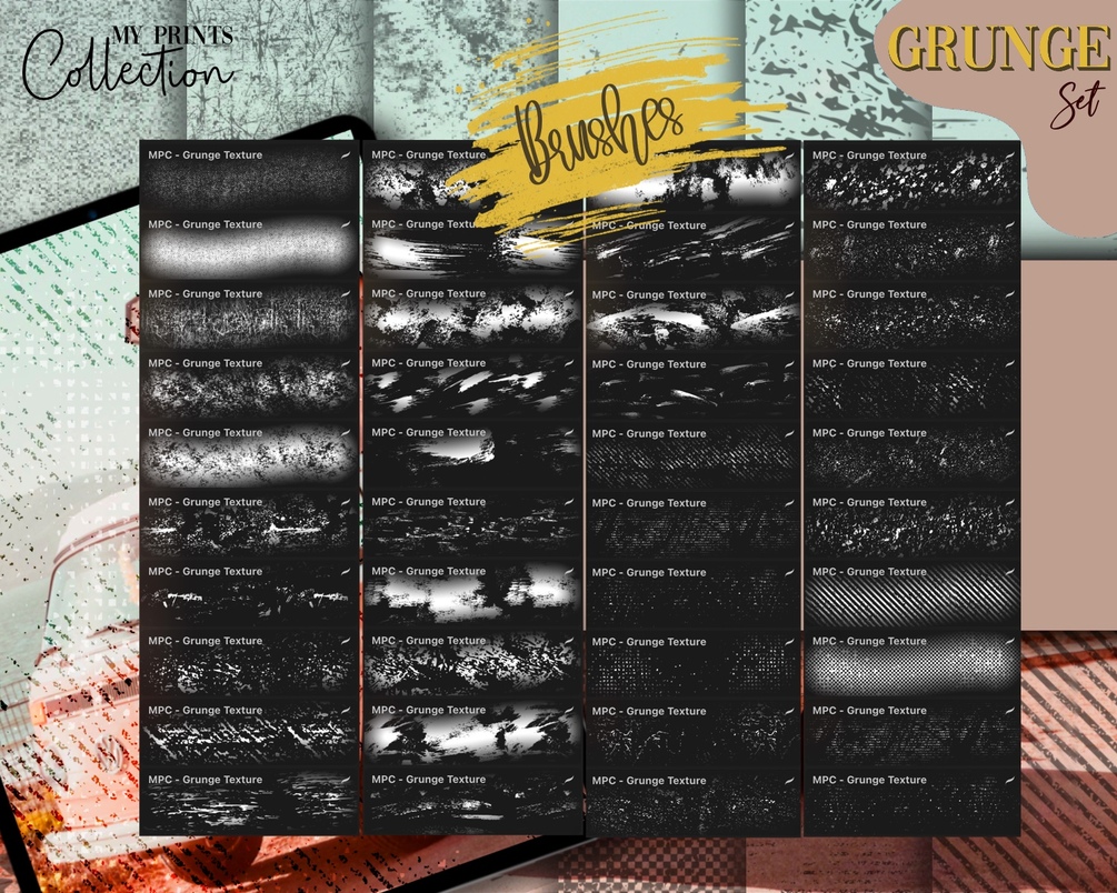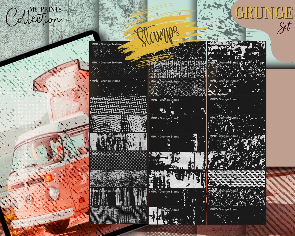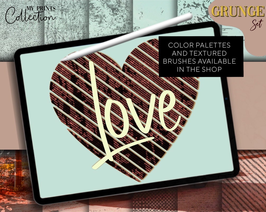 The Grunge Procreate Set has 42 Seamless Brushes and 28 Stamps to add a grungy, retro, vintage, grain or cracks to your digital art.