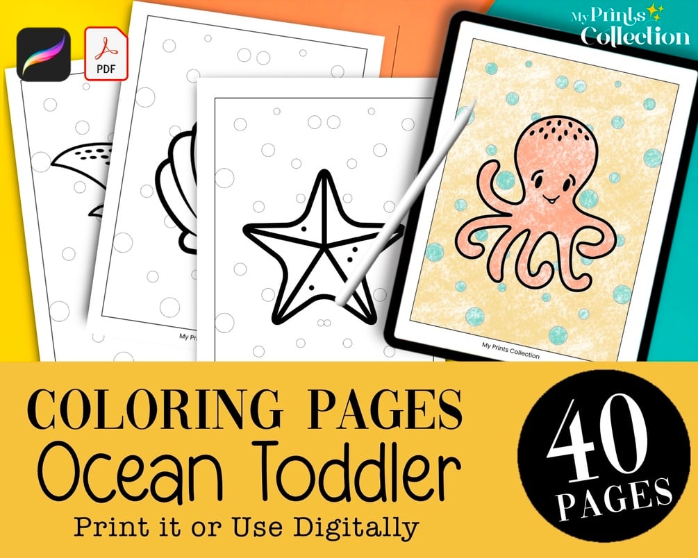 The Ocean Toddler Coloring Pages for Kids and Toddlers has 50 Coloring Pages and Sheets PDF that you can print or color digitally using Procreate. Perfect for birthday gifts, wedding or travels.